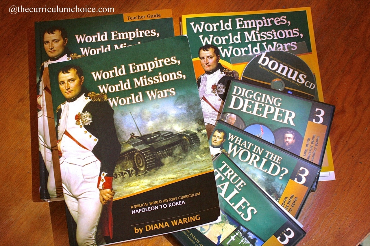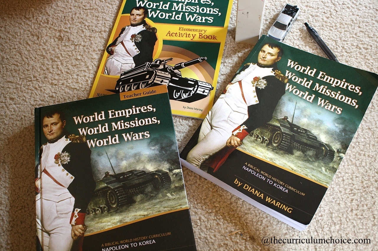 We have been enjoying the Full Family Curriculum Pack – World Empires, World Missions, World Wars. What I love about this history and Biblical worldview resource is that I can use it for all of our ages. Yes, for kindergarten, second grade, sixth grade, ninth grade and tenth grade. In our homeschool, we do the basic three Rs in the morning.