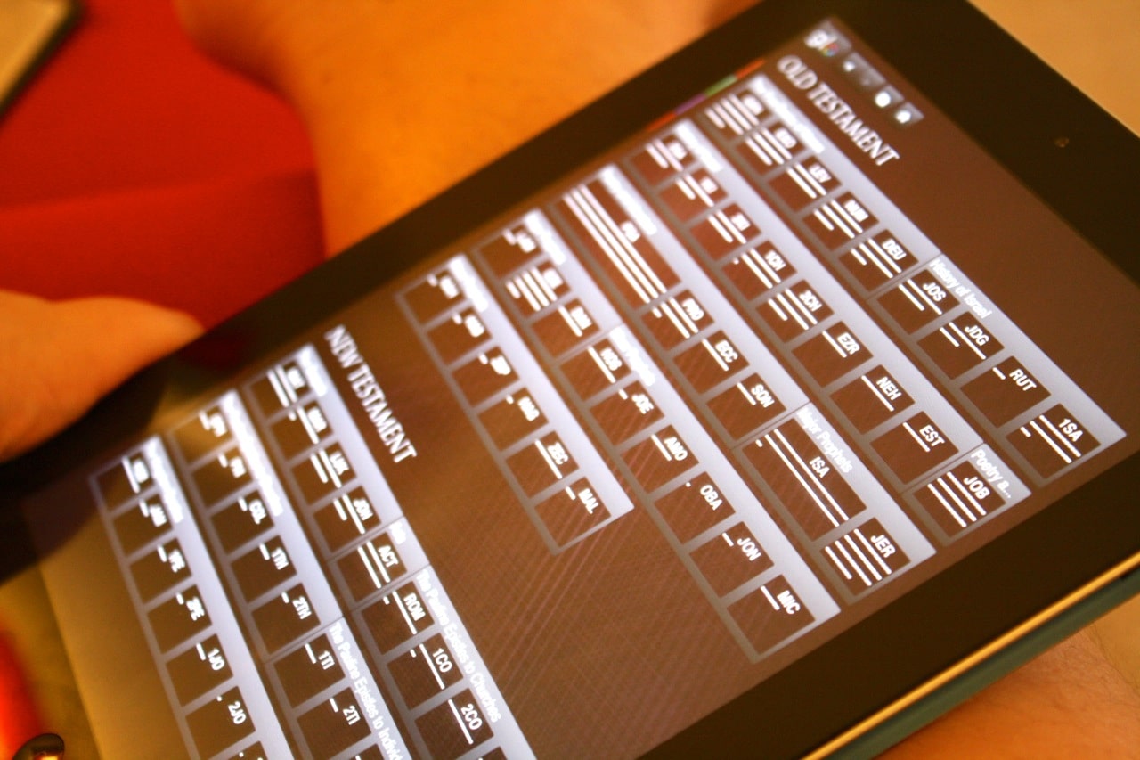 The Bible lens opens with a graphical representation of the 66 books of the bible. Clicking on a book opens a chapter view, clicking on a chapter opens the bible viewer, presenting the text. Once you are viewing the text, the lower third of the viewer presents study notes, personal notes, and artwork/photos. The artwork and photos are beautiful high-resolution images of things like the ceiling of the Sistine Chapel. In the study notes section you’ll find the standard notes included with the different translations of the Bible. You can make your own personal notes as well.