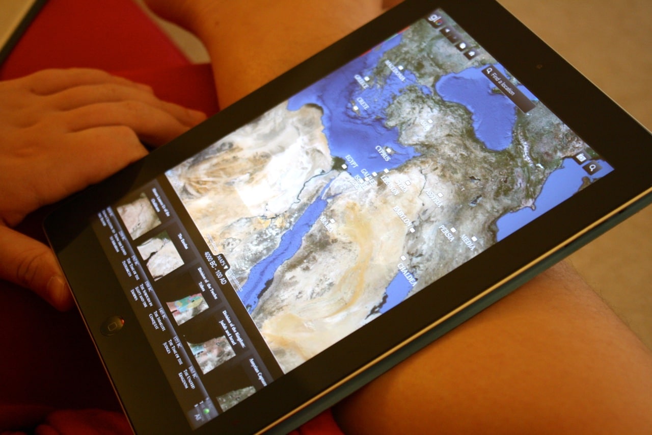 Presents the biblical text with geographical emphasis. A map viewer is presented. Clicking on a location brings up scriptures mentioning the location, articles about the location, photos of the location, artwork of the region, virtual tours, and additional maps of historical events in the location or region.