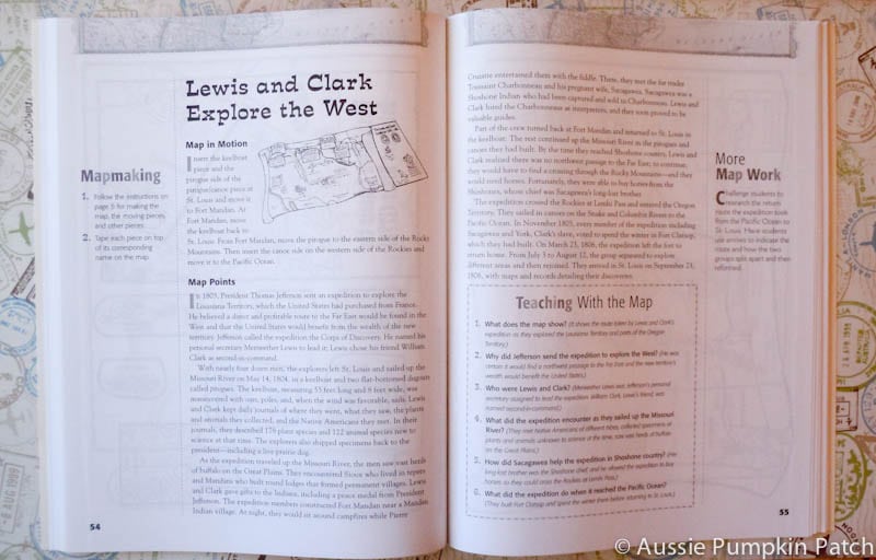 The next two pages are the actual map and pieces that go with it. So for instance, with Lewis & Clark you’ll have two pieces of map, various forts, Indian villages and boats. The children colour the maps and pieces and then assemble everything together.