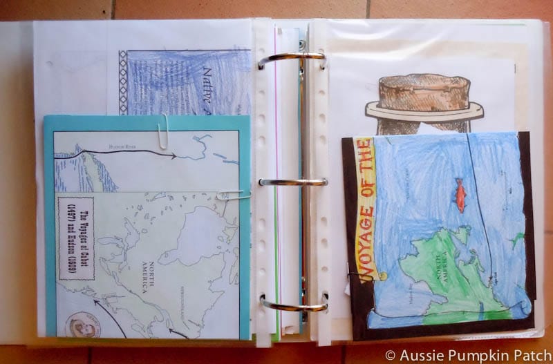 This allows us to fold the map neatly, paperclip all the accessories to the map & tuck it into a nifty page protector {I love those things!} before we put the whole thing right into the kids timeline notebook. Easy Peasy!