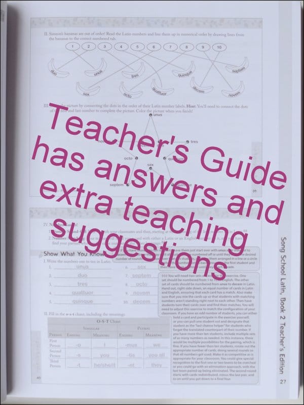 - Song School Latin, Book 2 Teacher’s Edition: This book includes 1/2 size copies of the student book in its entirety, with answers filled in and some extra teaching suggestions in small gray boxes. Also included are about 40 pages of extra practice like crossword puzzles and word searches, which you can photocopy to use within your family.