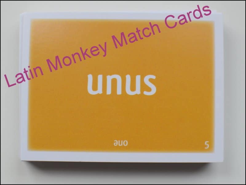 - Monkey Match Cards: These paired cards have the Latin or English word in large print with the translated word in smaller print near the bottom. They can be used as flashcards (covering the translated word with your finger), and instructions are included for games like Memory, Go Fish, and Old Maid.