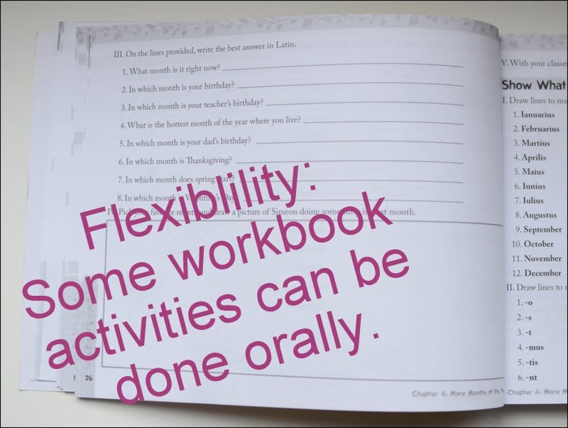 There is flexibility in the available materials. We’re still working on my son’s spelling of English words and I worry about confusing him spelling Latin words (especially with vowel sounds), so we skip most of the written activities. I write down our new words and post them so as we’re listening to the songs he sees them.