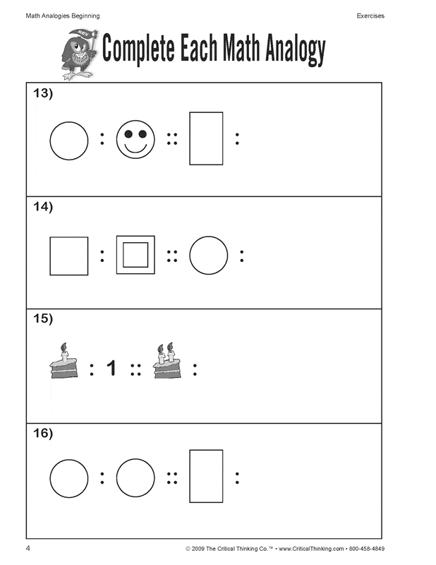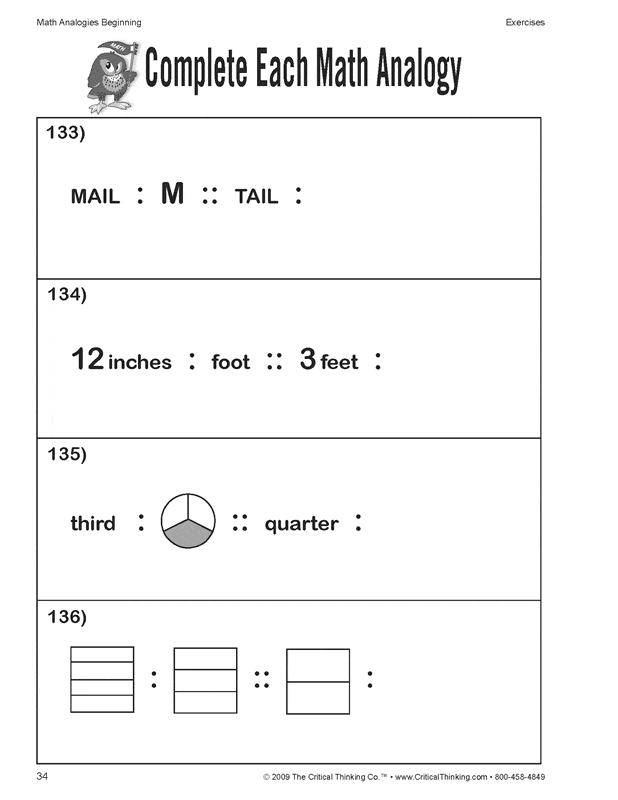We requested, and were given, “Math Analogies Beginning” from The Critical Thinking Co. Anything from this company is awesome but we are particularly excited about this book. If you are serious about your child’s mathematical development, than you need to add critical thinking and analogical thinking to your curriculum. Here is a sneak peek of two of the 38 pages from the book (just click on them to make them larger):