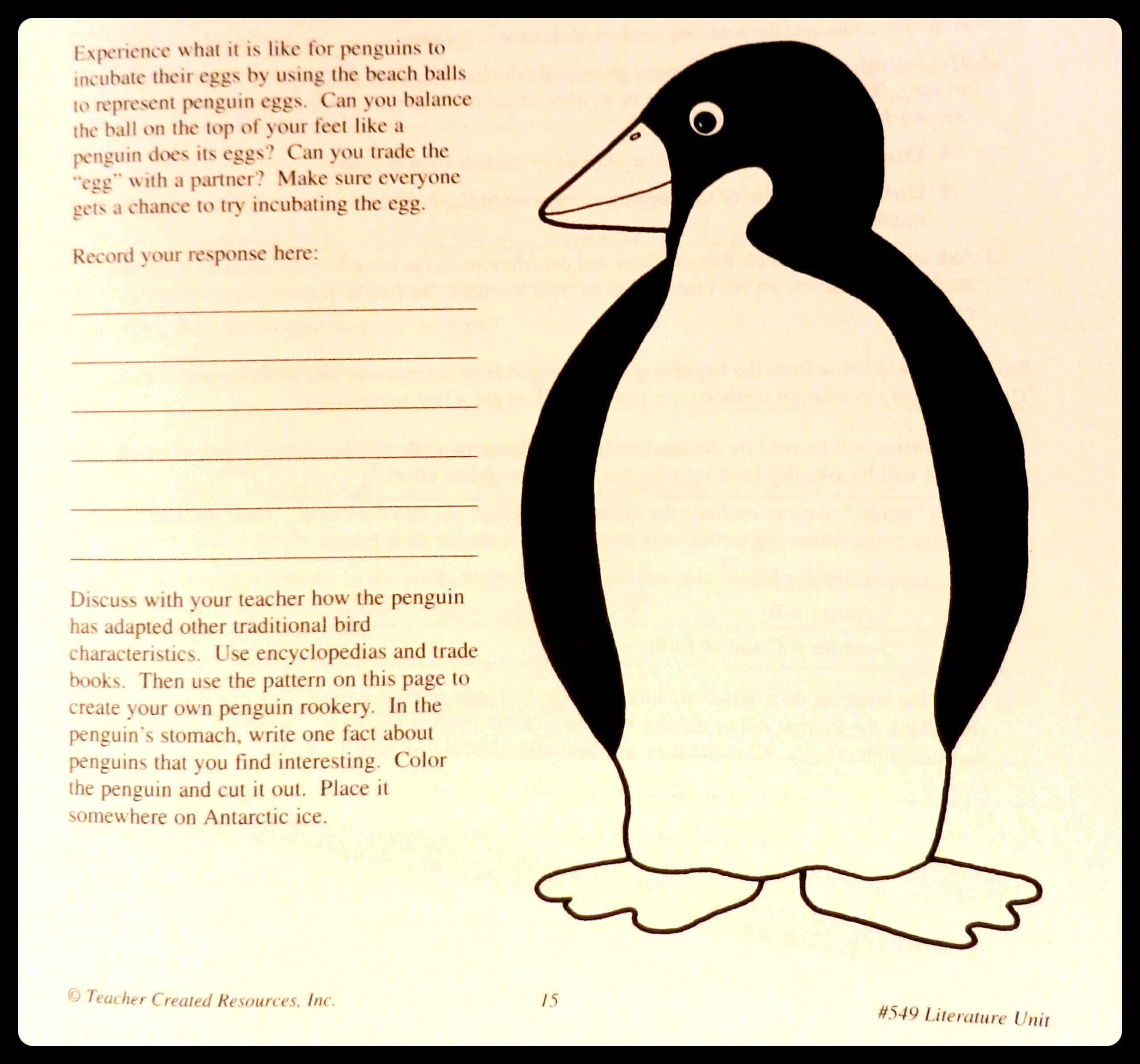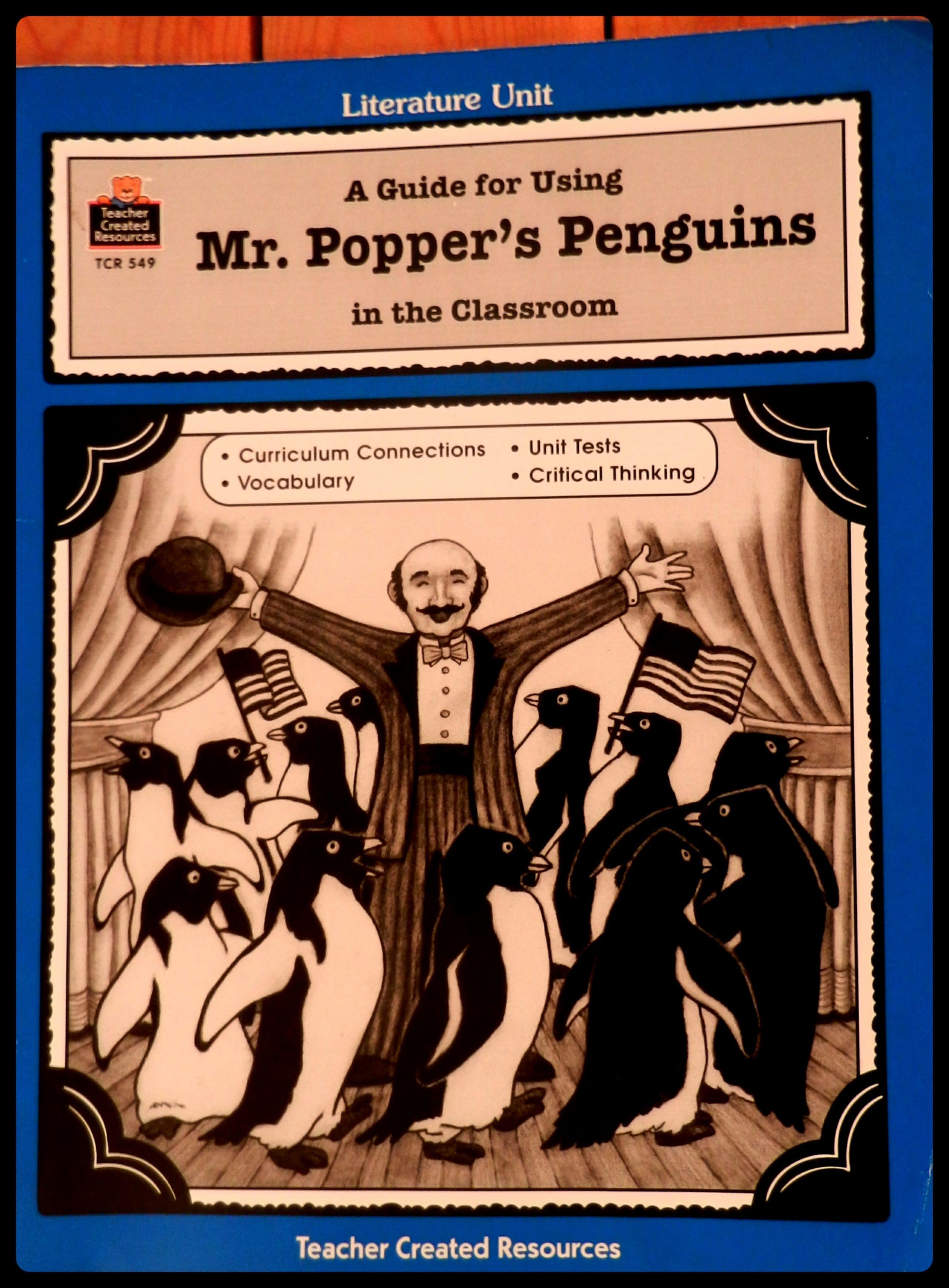 I wanted my daughter to work on her comprehension skills and vocabulary, as well as begin to develop skills in writing book reports. So, together, at the library, we went online looking for something that would fit. Soon, we found a wonderful Literature Guide for Mr. Popper’s Penguins, made by a company called Teacher Created Resources. It fit the bill!