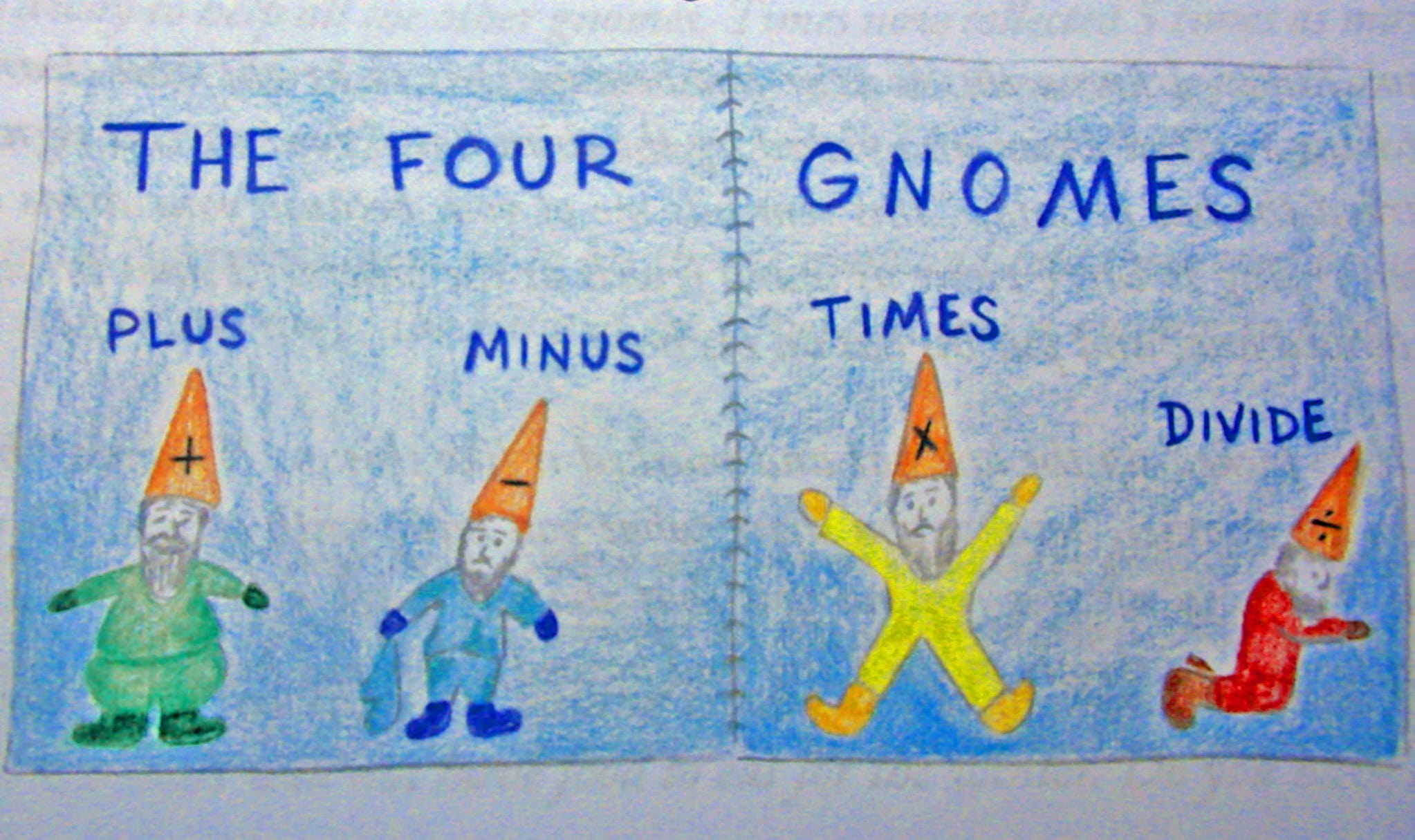 There was a gnome for each process, adding, subtracting, etc. For example, the Plus Gnome (see above) was a fat little one who liked to fill all of his pockets with treasures. That’s addition! Then for subtraction – see how sad the Minus gnome looks? That’s because he has lost something through the holes in his pockets! Each gnome was shaped according to its function. I loved using these gnomes to introduce these math concepts to my daughter. It helped my daughter to love her math lessons! They were so fun to draw and to use in story problem drawings in the lessons.