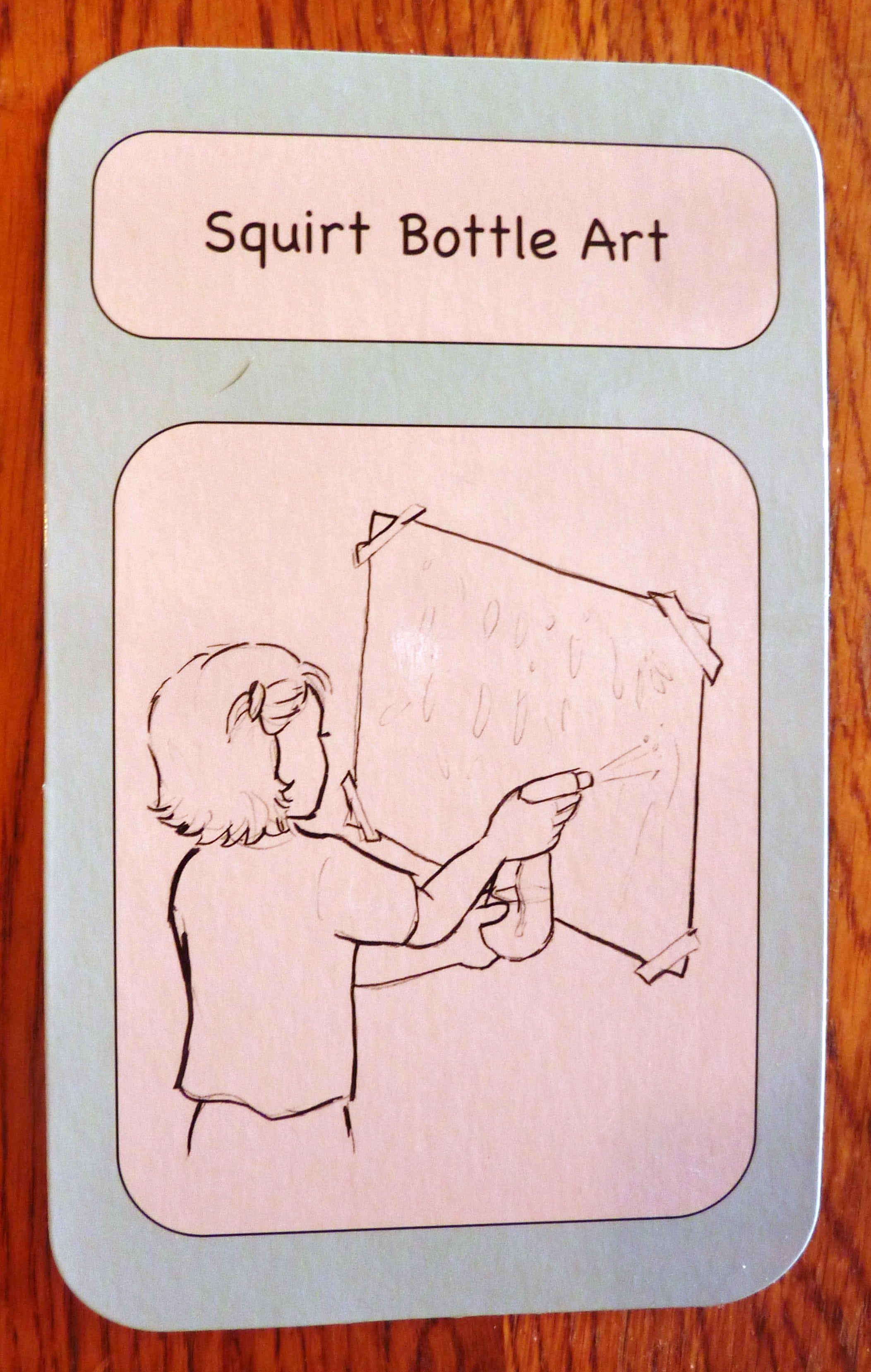 In Squirt Bottle Art, the child squirts colored water onto a sheet a paper that is taped to the fridge so that it is high up. This not only strengthens the hand muscles, it also provides practice in using the little shoulder movements necessary for good handwriting. And it’s fun!