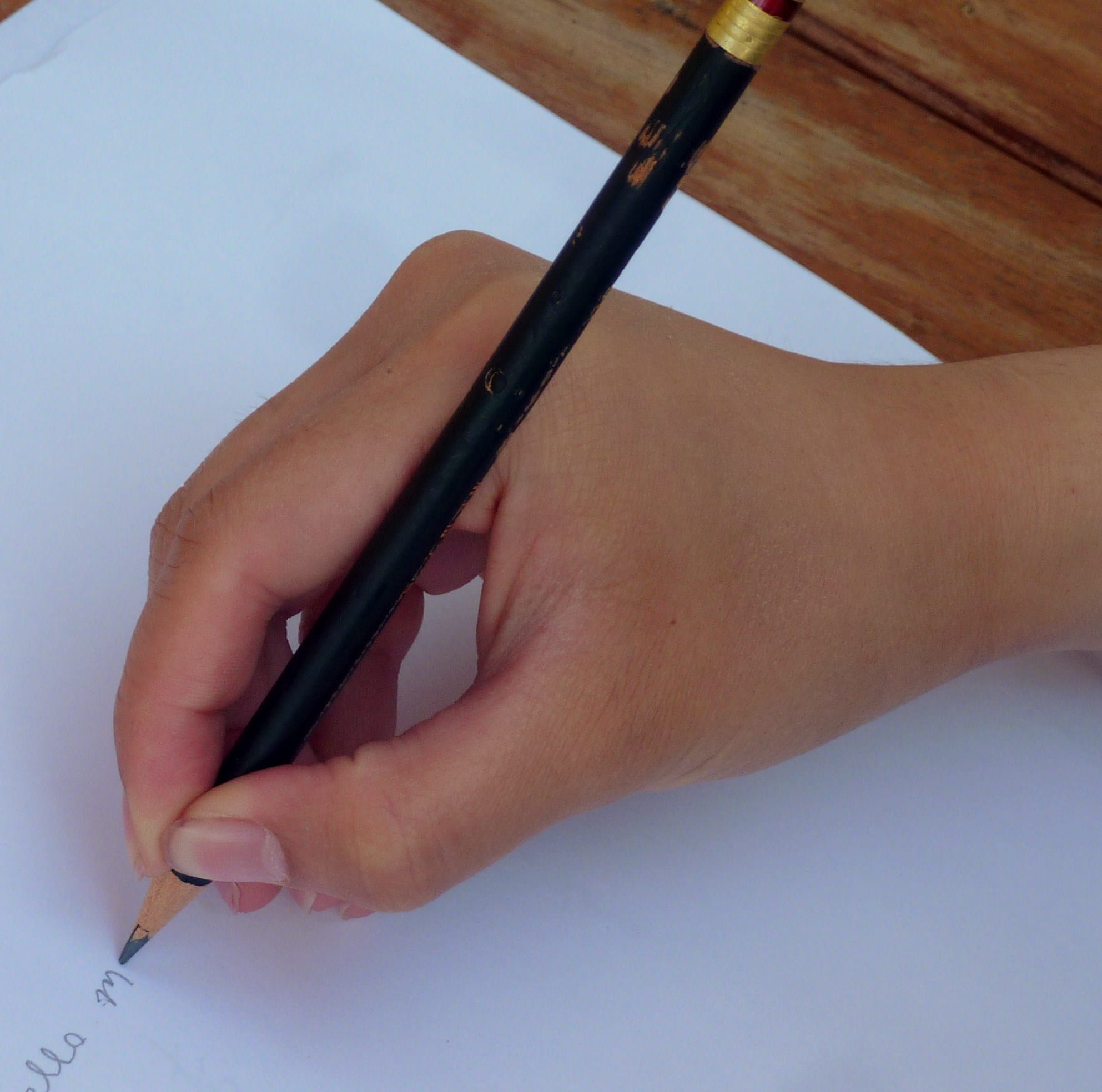 Kids often start with a “palmar grip” pattern, which means holding the crayon in the palm of the hand, with the fingers wrapped around it. This is very common, and a normal part of development. Some kids naturally move to the fine pincer grip, over the years, as they grow, but some kids don’t. There are ways to encourage this more controlled grip, for handwriting. As you see in the photo above, the fine pincer grip is simply refers to the the way we adults usually hold our pens. Holding the tip of pencil or pen with the tips of the thumb and first two fingers – that’s a fine pincer grip.