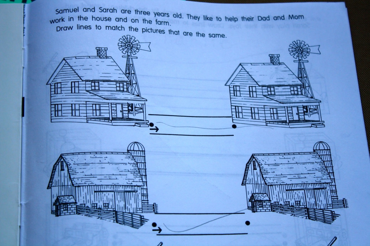 “Samuel and Sarah are three years old. They like to help their Dad and Mom work in the house and on the farm. Draw lines to match the pictures that are the same.”