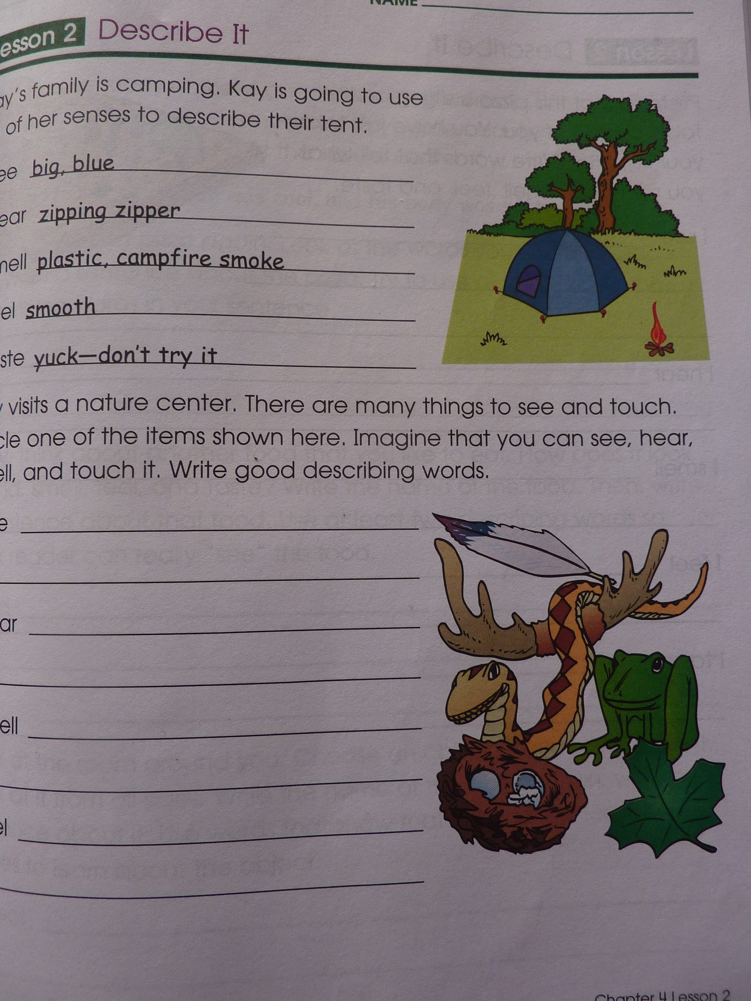 - Chapter 4 – Describing – and the Five Senses – Such as “Take a bite of pizza. I see __________. I taste ________. I smell ___________.”